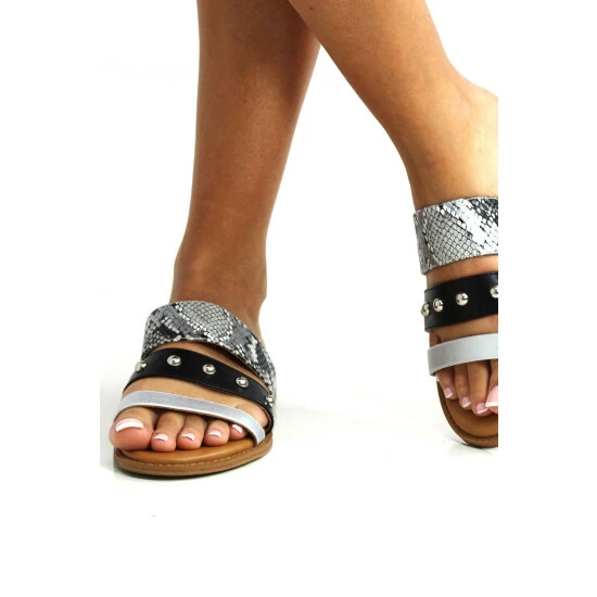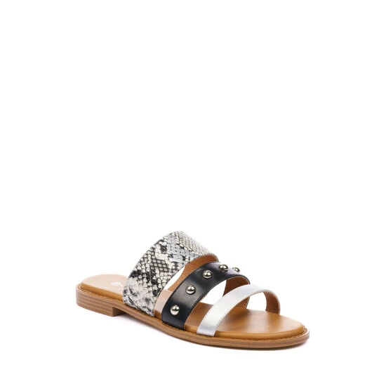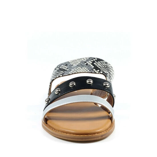 The Adelaide, a triple strap, slip on mule. The upper strap features a snake print design whilst the middle features raised studs.