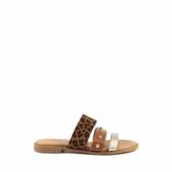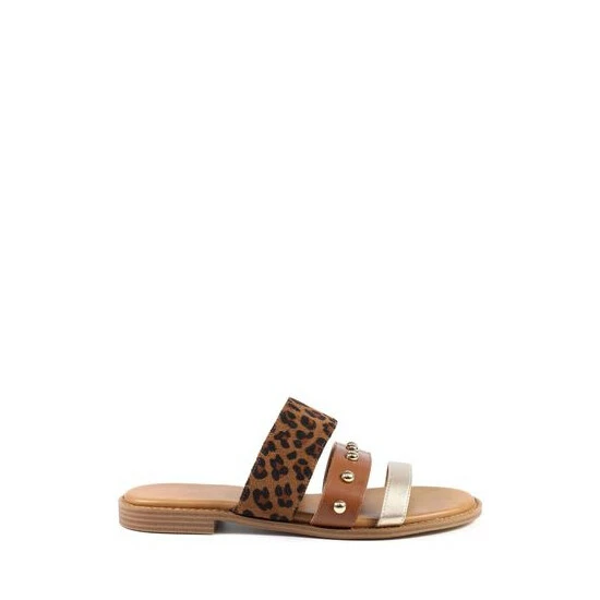 The Adelaide, a triple strap, slip on mule. The upper strap features a snake print design whilst the middle features raised studs.
